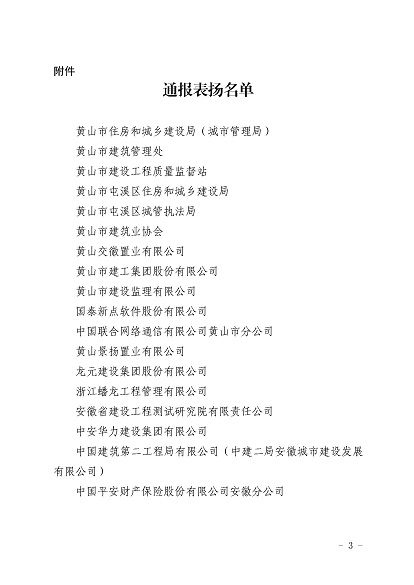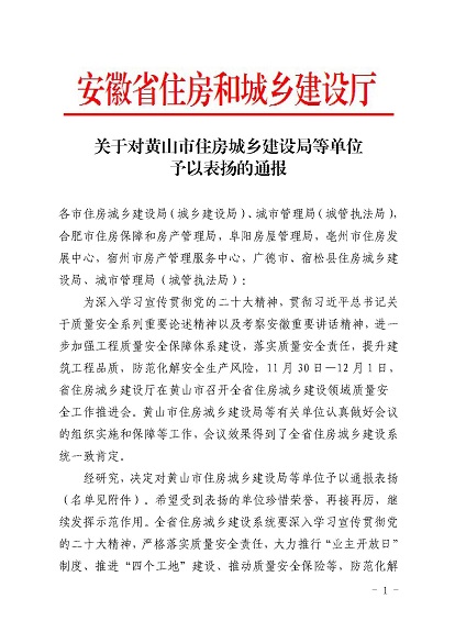 近日,安徽省住房和城鄉(xiāng)建設(shè)廳印發(fā)《關(guān)于對黃山市住房和城鄉(xiāng)建設(shè)局等單位予以表揚(yáng)的通報(bào)》,《通報(bào)》指出,11月30日-12月1日,省住房和城鄉(xiāng)建設(shè)廳在黃山市召開全省住房建設(shè)領(lǐng)域質(zhì)量安全工作推進(jìn)會(huì),會(huì)議效果得到全省住房城鄉(xiāng)建設(shè)系統(tǒng)一致肯定,并對在此次會(huì)議認(rèn)真做好組織實(shí)施和保障的單位予以通報(bào)表揚(yáng),黃山市建工集團(tuán)股份有限公司作為唯一一家本土建筑施工企業(yè)榮獲表揚(yáng)。